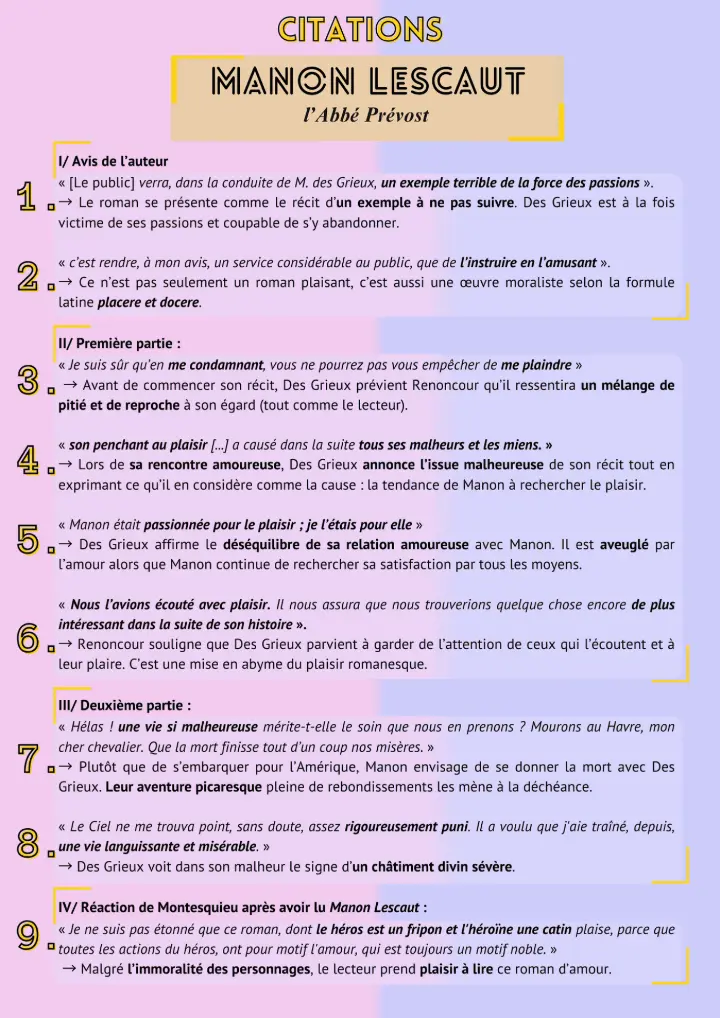 Voici une sélection de citations pour réussir vos dissertes sur Manon Lescaut ainsi que pour les ouvertures et les accroches de vos explications.