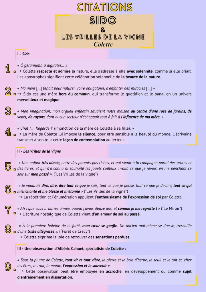 Voici une sélection de citations pour réussir vos dissertes sur Sido et Les Vrilles de la vigne ainsi que pour les ouvertures et les accroches de vos explications.