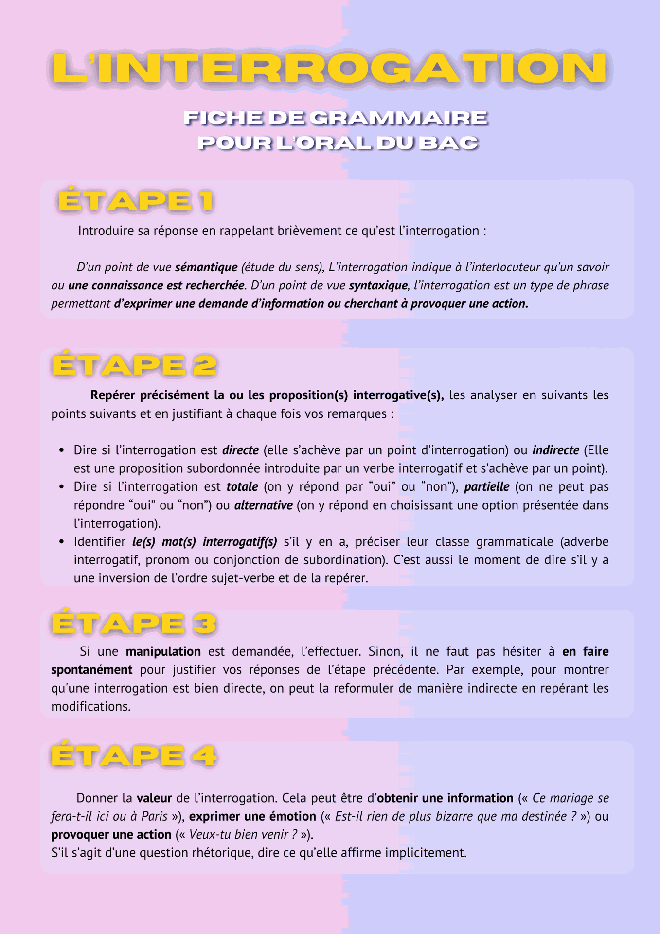 - Identifier le(s) mot(s) interrogatif(s) s’il y en a, préciser leur classe grammaticale (adverbe interrogatif, pronom ou conjonction de subordination). C’est aussi le moment de dire s’il y a une inversion de l’ordre sujet-verbe et de la repérer.