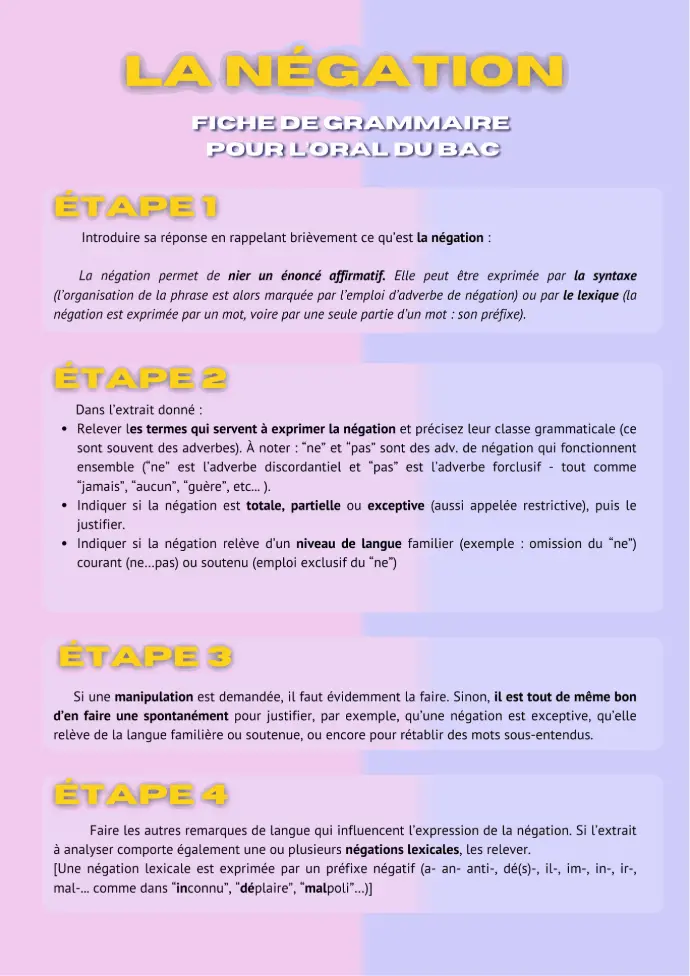 - Relever les termes qui servent à exprimer la négation et précisez leur classe grammaticale (ce sont souvent des adverbes). À noter : “ne” et “pas” sont des adv. de négation qui fonctionnent ensemble (“ne” est l’adverbe discordantiel et “pas” est l’adverbe forclusif - tout comme “jamais”, “aucun”, “guère”, etc... ).