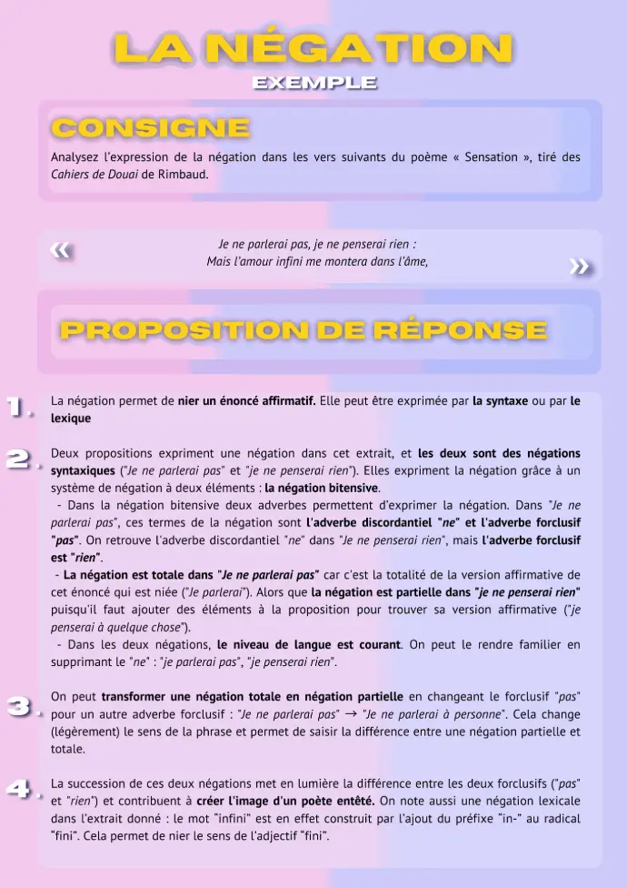 nalysez l’expression de la négation dans les vers suivants du poème « Sensation », tiré des Cahiers de Douai de Rimbaud.